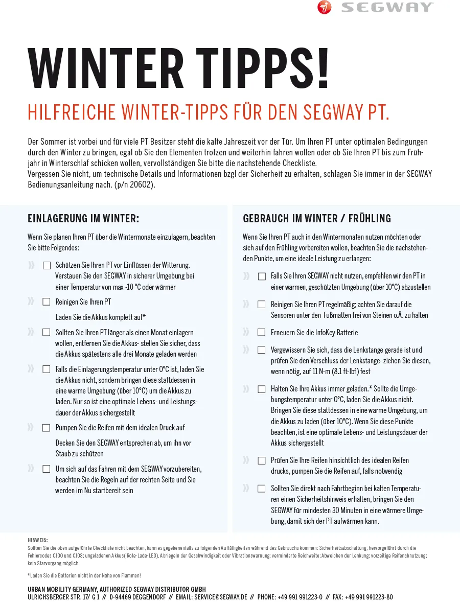 Bitte gültigen Führerschein und Reisepass/Personalausweis mitbringen. Der SEGWAY ist versichert. Es besteht eine Haftpflichtdeckung sowie eine Kaskodeckung (Selbstbehalt € 250,-/bzw. 10 % vom Neuwert). Eine weitergehende Haftung für eigenes Verschulden wird nicht übernommen (Haftungsausschluss).